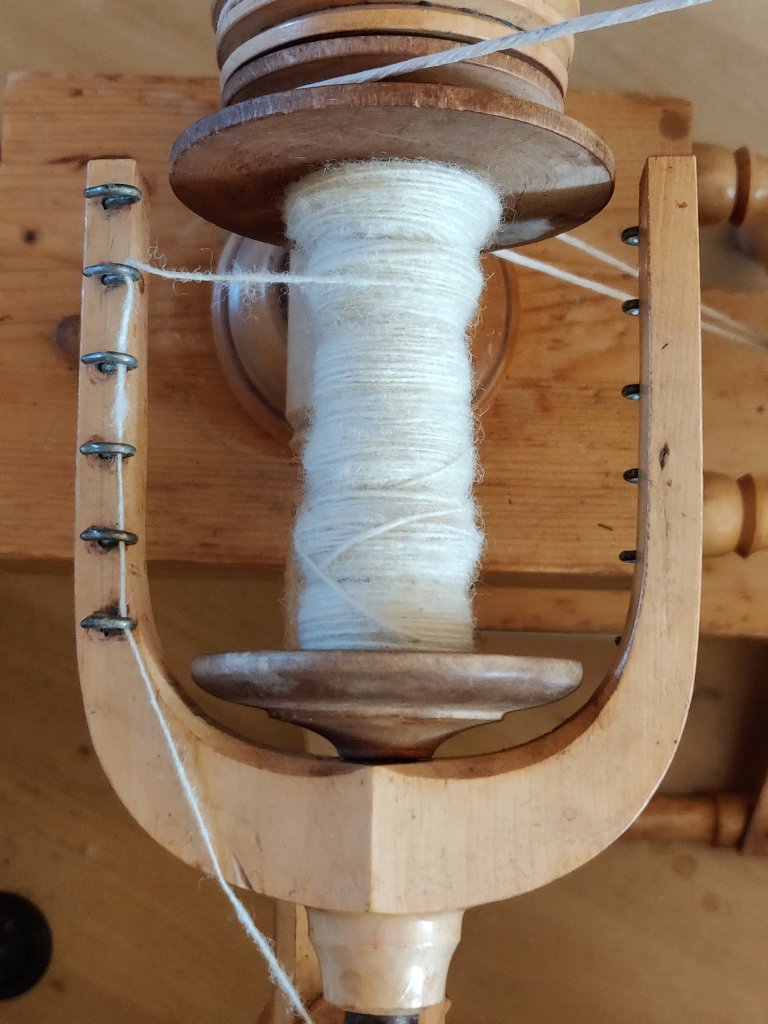 For example: I was working with a 1:6 whorl, therefore one revolution of my wheel would turn the bobbin 6 times. I was spinning ‘Z’ twist with a long draw of 12″.