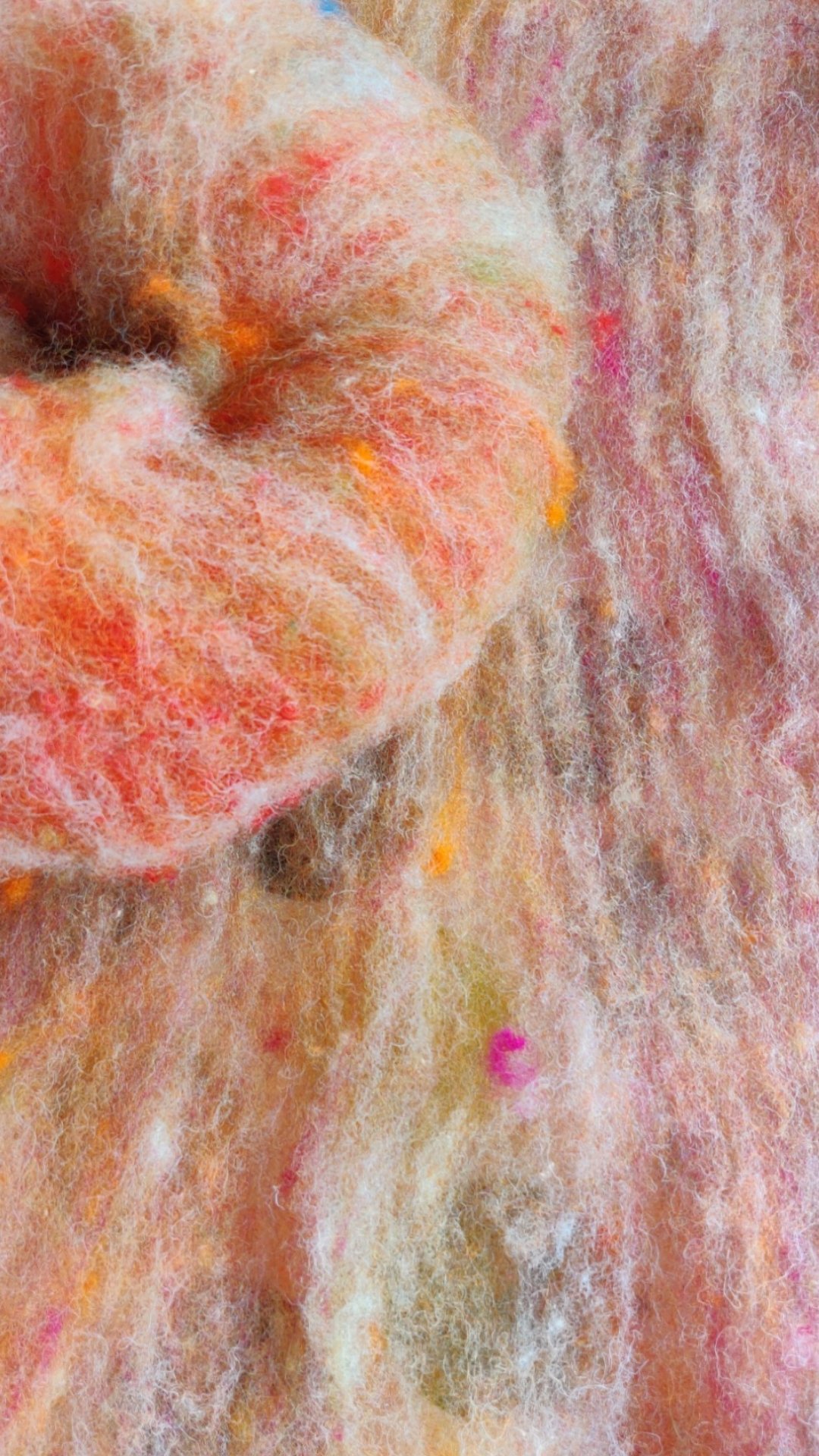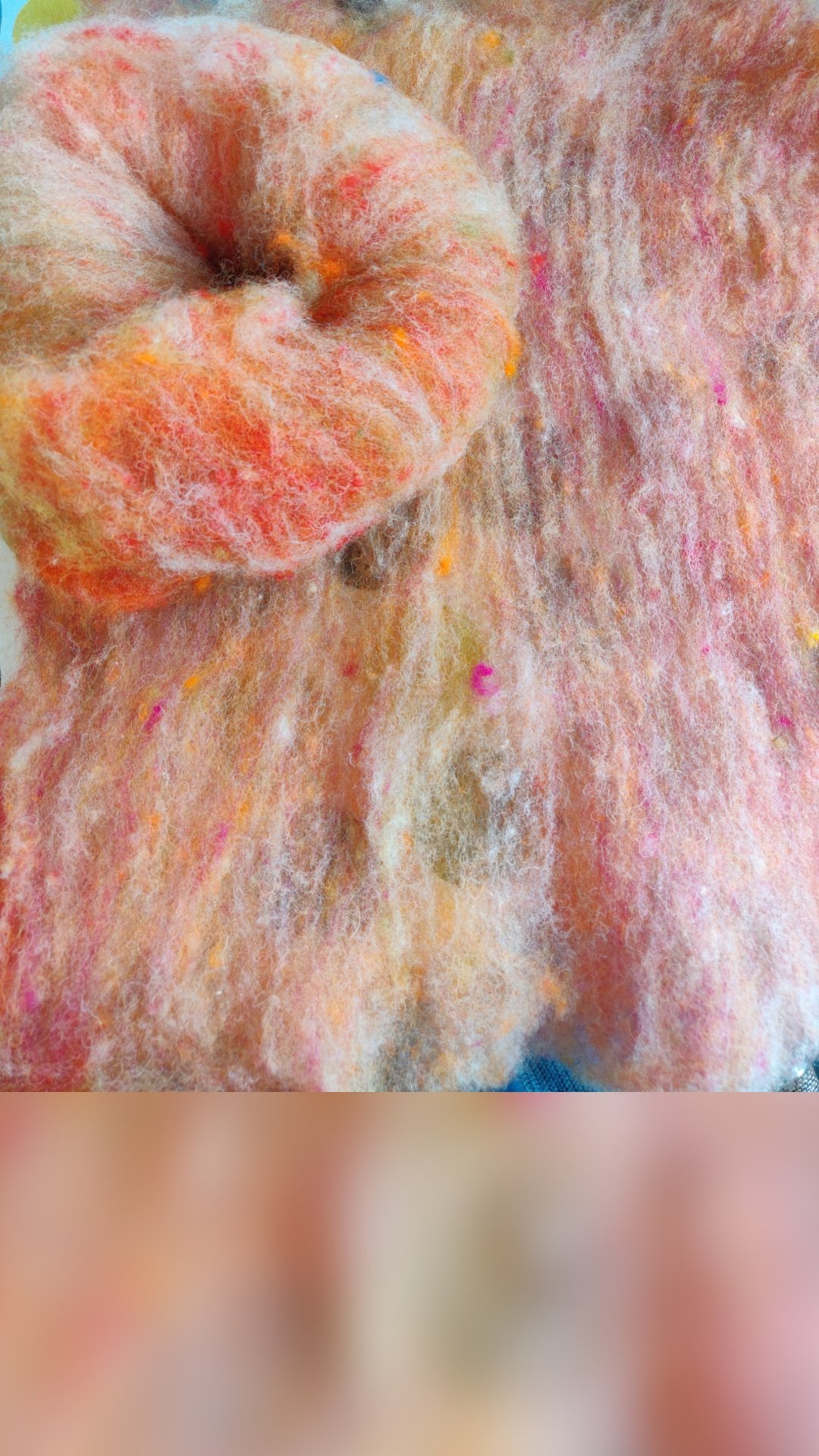 Cream Jacobs, pink and orange Dorset (a bit felted during dyeing) and a small amount of olive green Dorset fleece drum carded into several Frankenstein battsFor once I remembered to divide the rolags evenly between two bobbins for easy plying later on.