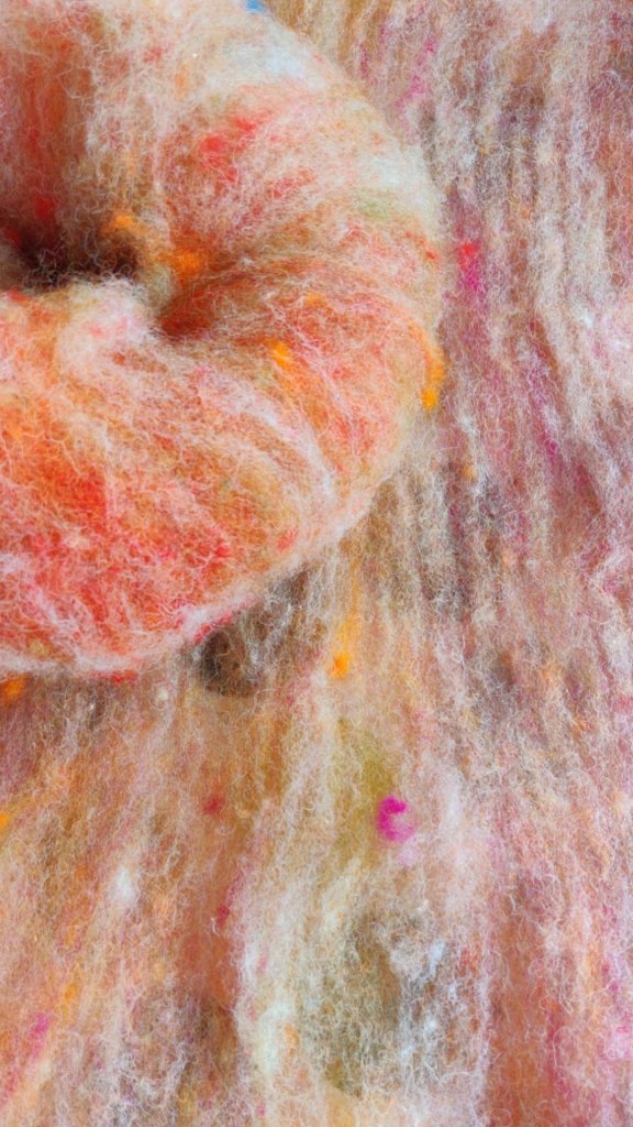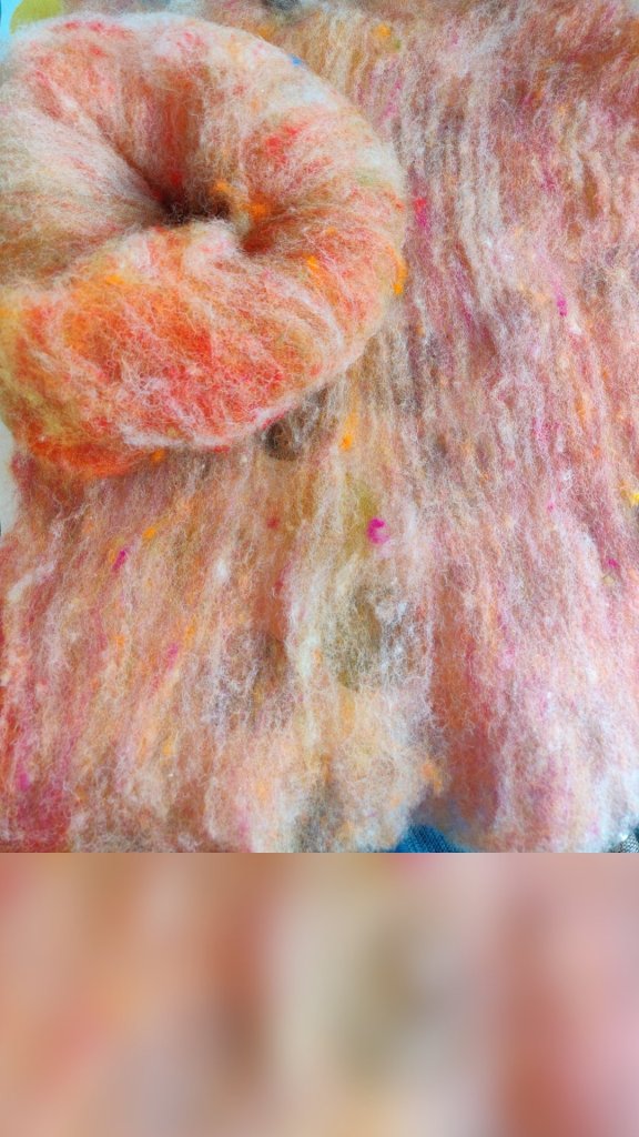 I tested this first on hand carders and it produced a very nice yarn so now I’ve done it in bulk and taken rolags of a batt from the drumcard.