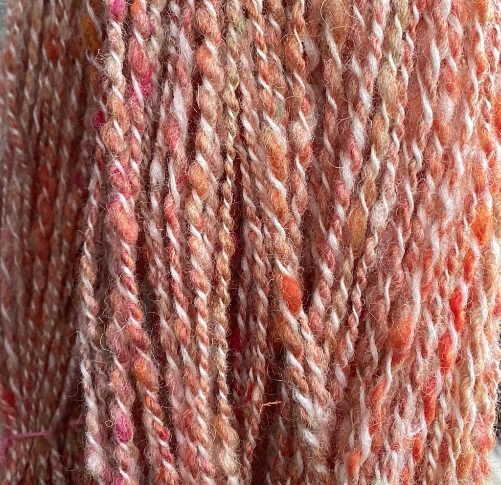 I can’t resist a marl yarn, so plied the colours into variations on this.