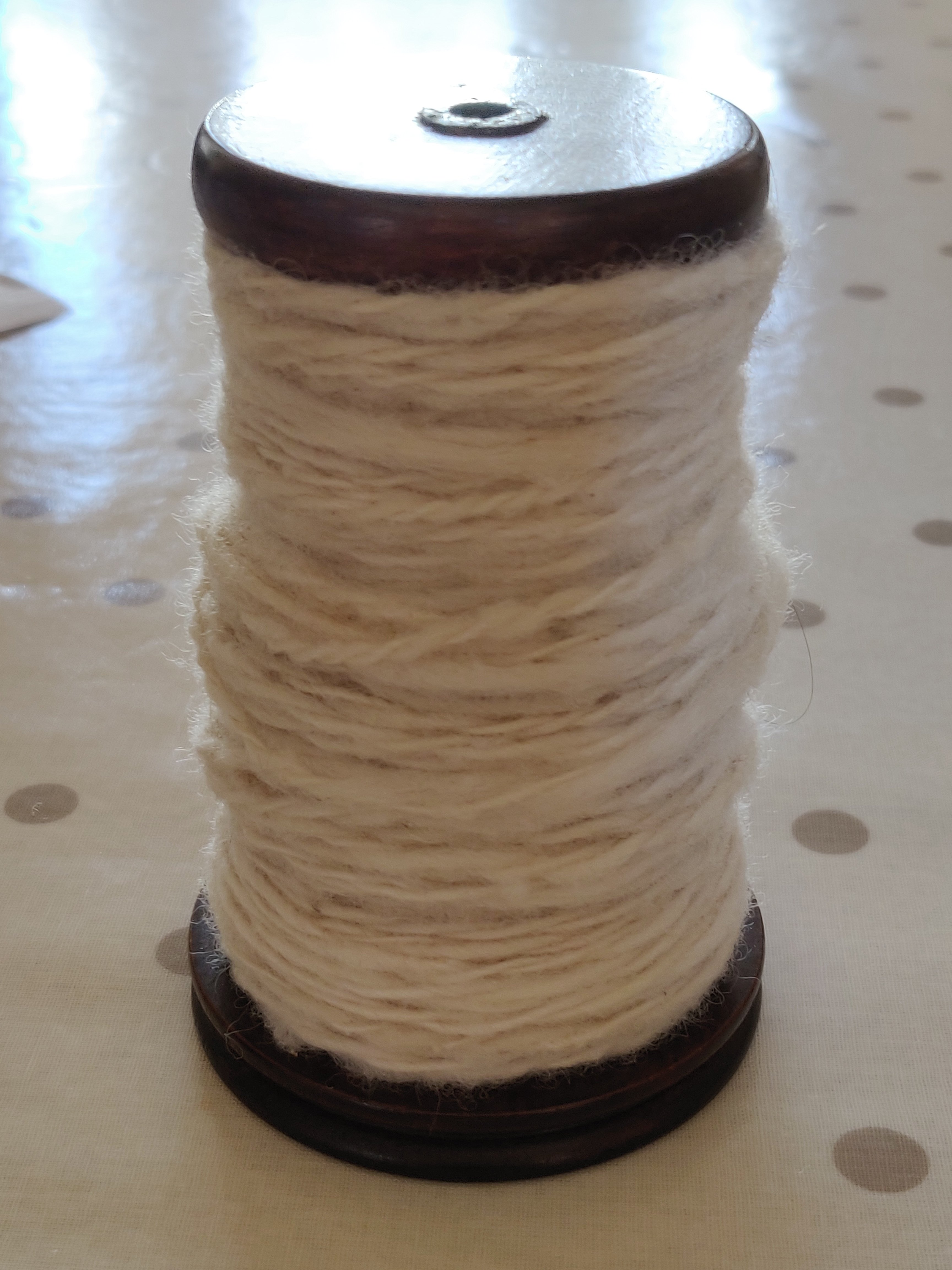 I love the final plying process when spinning yarn. This is Texel and Clun Forest wool fibre, processed from raw fleece. One single of each as an experiment.