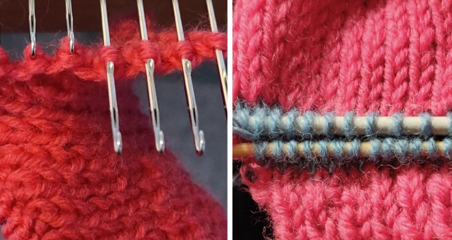 Back problems have meant I need to avoid computers and knitting machines for a while, so I wanted a hand knit project to work on. Digging around on shelves, ( I can’t get at my stash boxes at the moment) I found a bag of knitting I had forgotten about. Inside was the first few rows of a top-down sweater. I remembered how long it took to work out the pattern, (yes I did it myself) and how carefully I chose the yarn. The notes with the pattern are dated 2013, which says volumes about my engagement with larger hand knit projects!