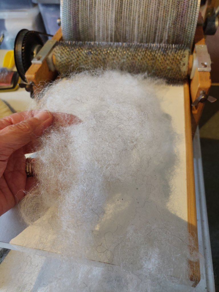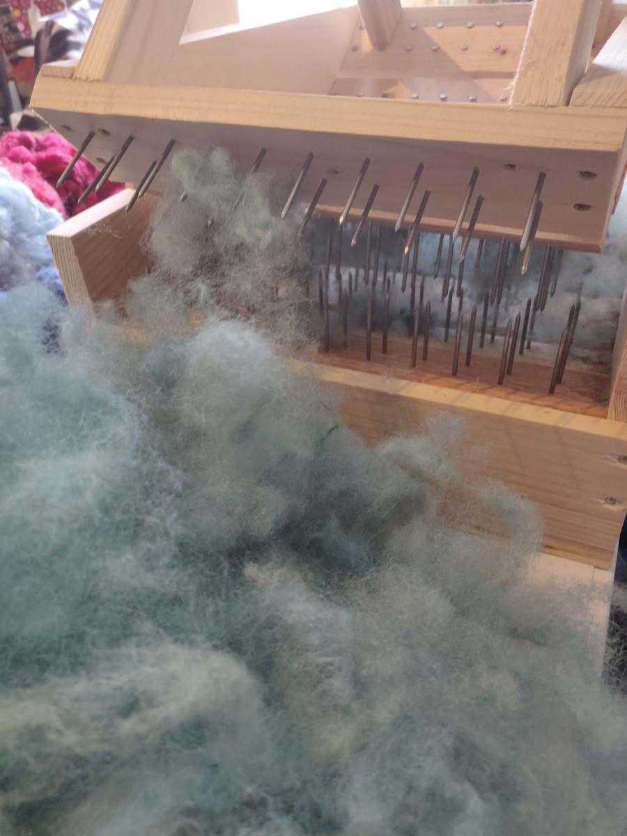 As you will see in the photos, the singles I spun are nothing to write home about, but its early days for the Irish tension set-up. The fibre is onion-skin dyed Lleyn blended, (rather poorly because I was in a hurry) with rust coloured Alpaca, then taken as tops off the drum-carder.