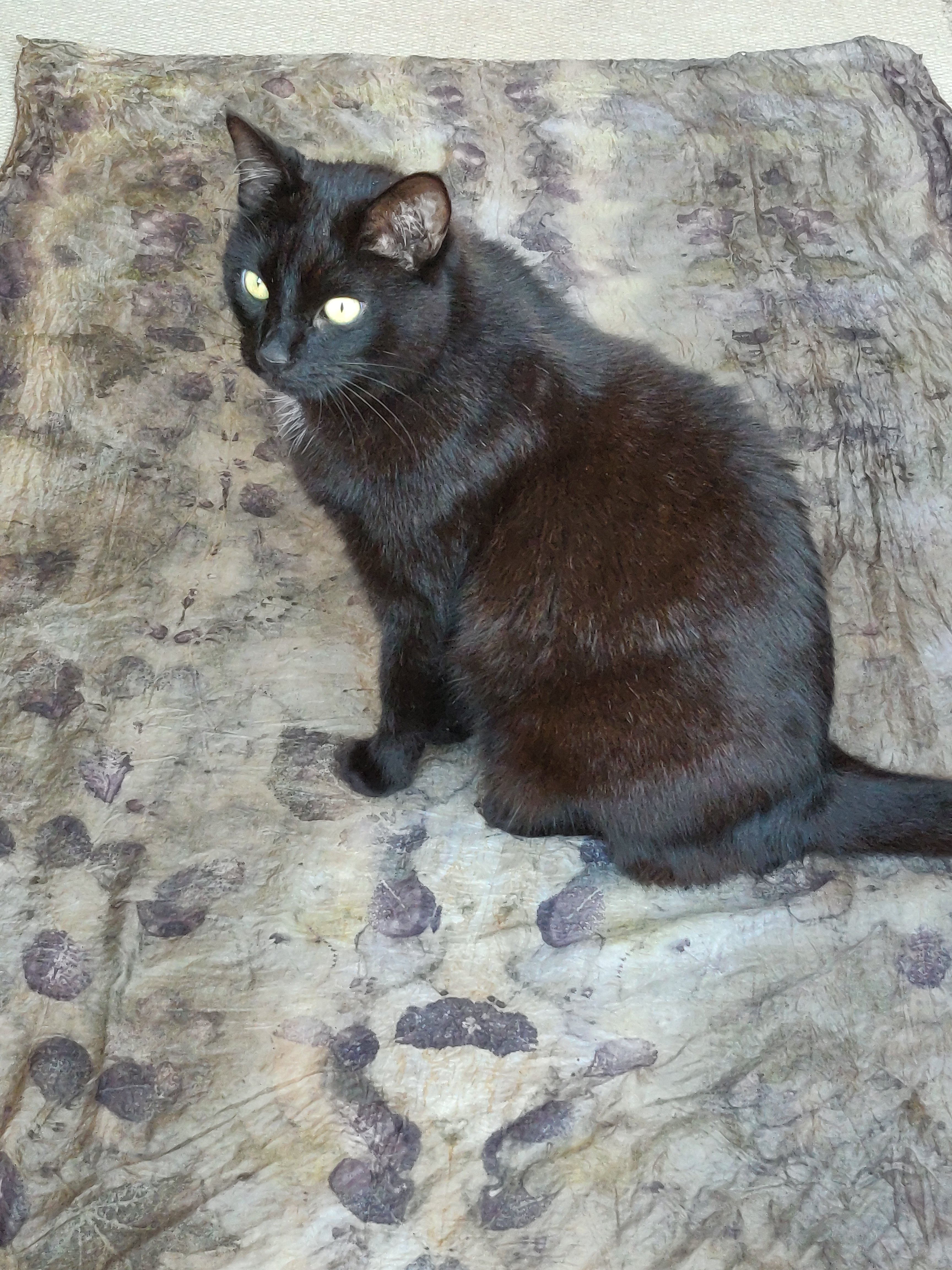 In my excitement I forgot to take a picture of the tie-dyed silk, or of laying out the leaves. I did that lengthwise along half of the width of the scarf, then folded it in half to sandwich the leaves between two layers. I’m not sure if this would have worked better if I had waited until the scarf had dried; I added the leaves directly after rinsing it after tie-dying.