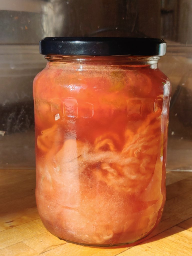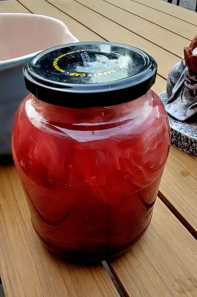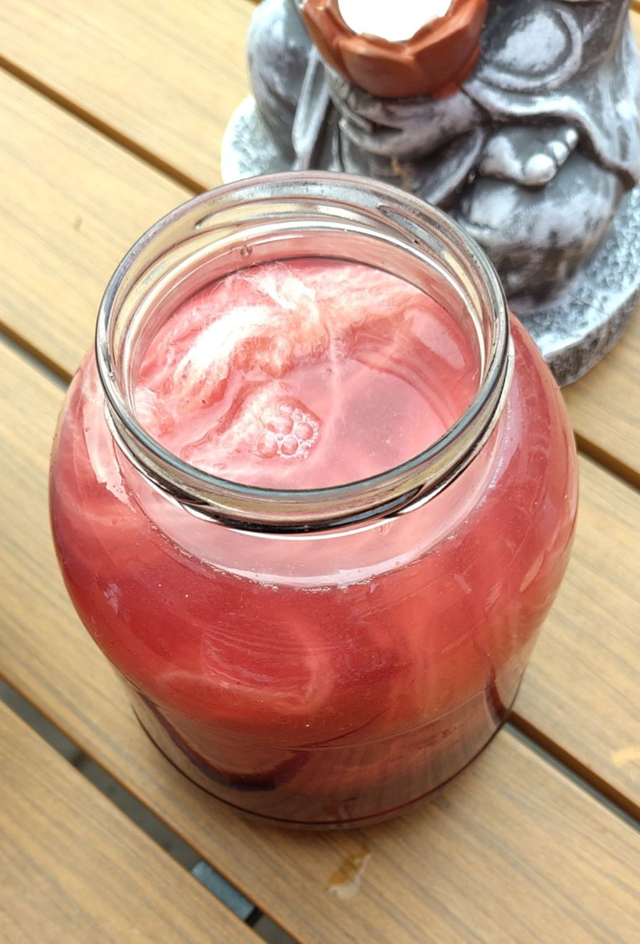 I’ve also put some over-ripe strawberries into a solar-dyeing jar next to the rose petals.