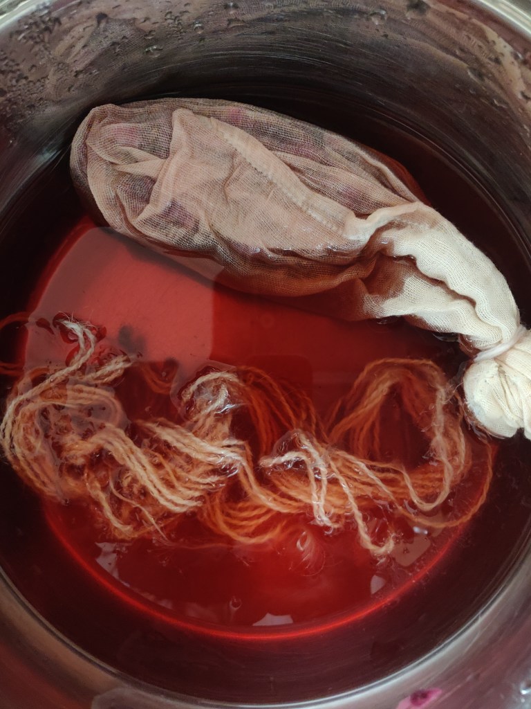 I tore up the petals and covered them in cold water, then added a little salt and white vinegar to the pot before gently heating it to below a simmer. I left the petals overnight to steep and strained the liquid off this morning. After that I put the drained petals into a muslin bag, returned this to the pan and added a skein of wet mordanted yarn to the cold liquid before reheating to a mid range temperature.