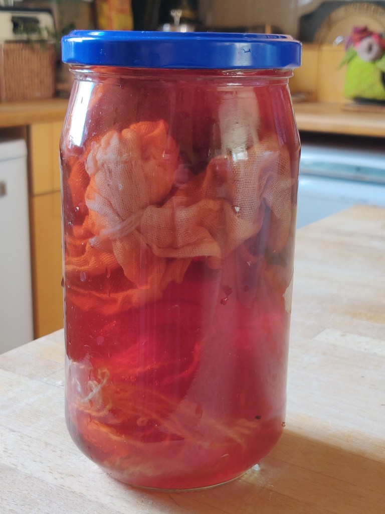 After heating the dye I poured the contents of the pan into a large lidded jar and have left it to steep for as long as it needs…