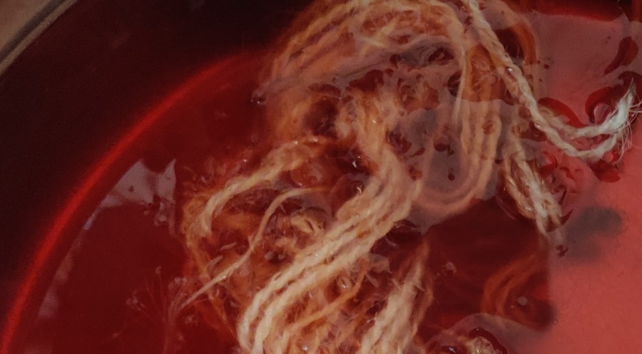 I’ve got a pot of onion skin dye ready to tie-dye a silk scarf and a skein of hand spun Jacobs marl yarn.