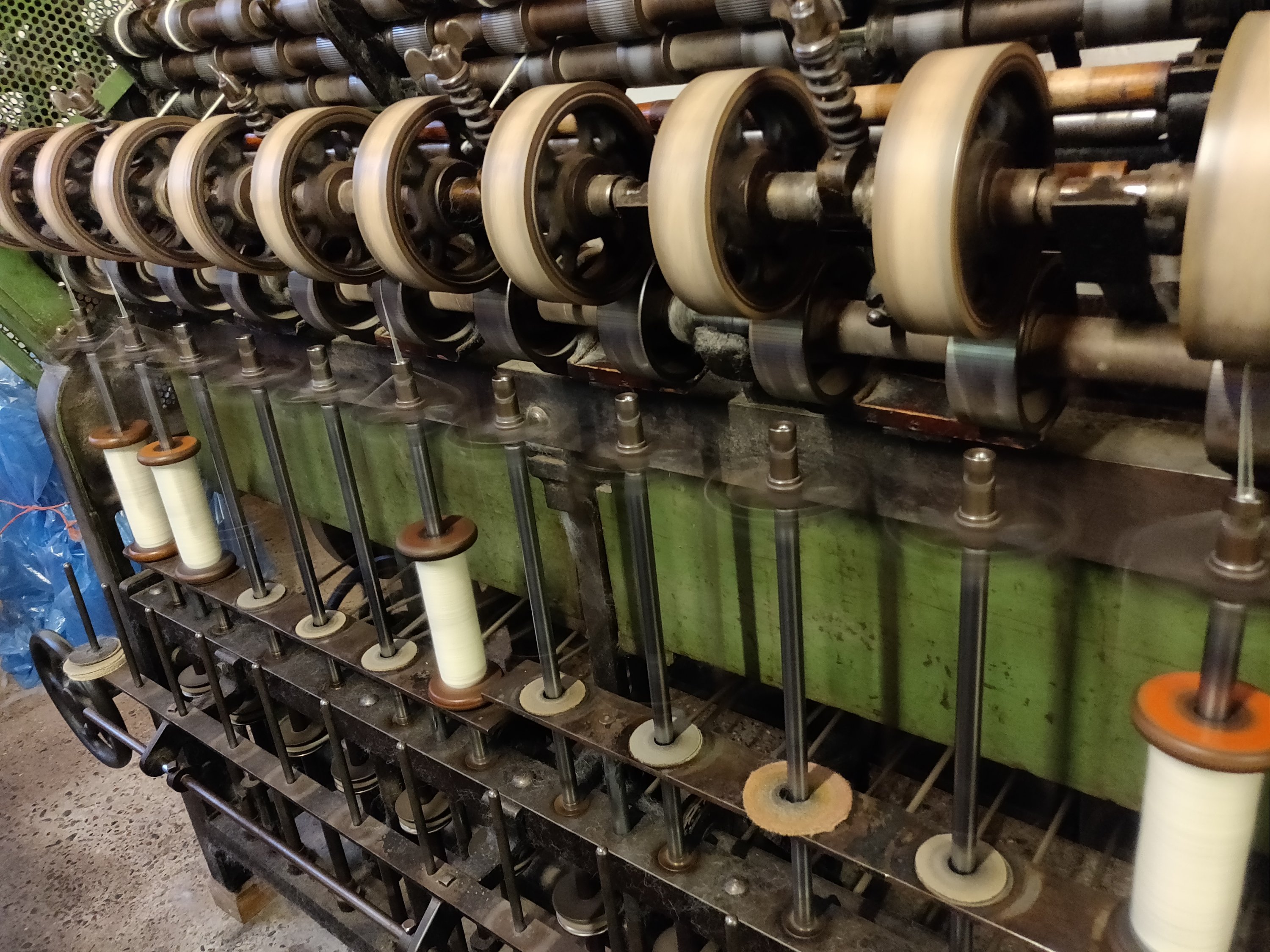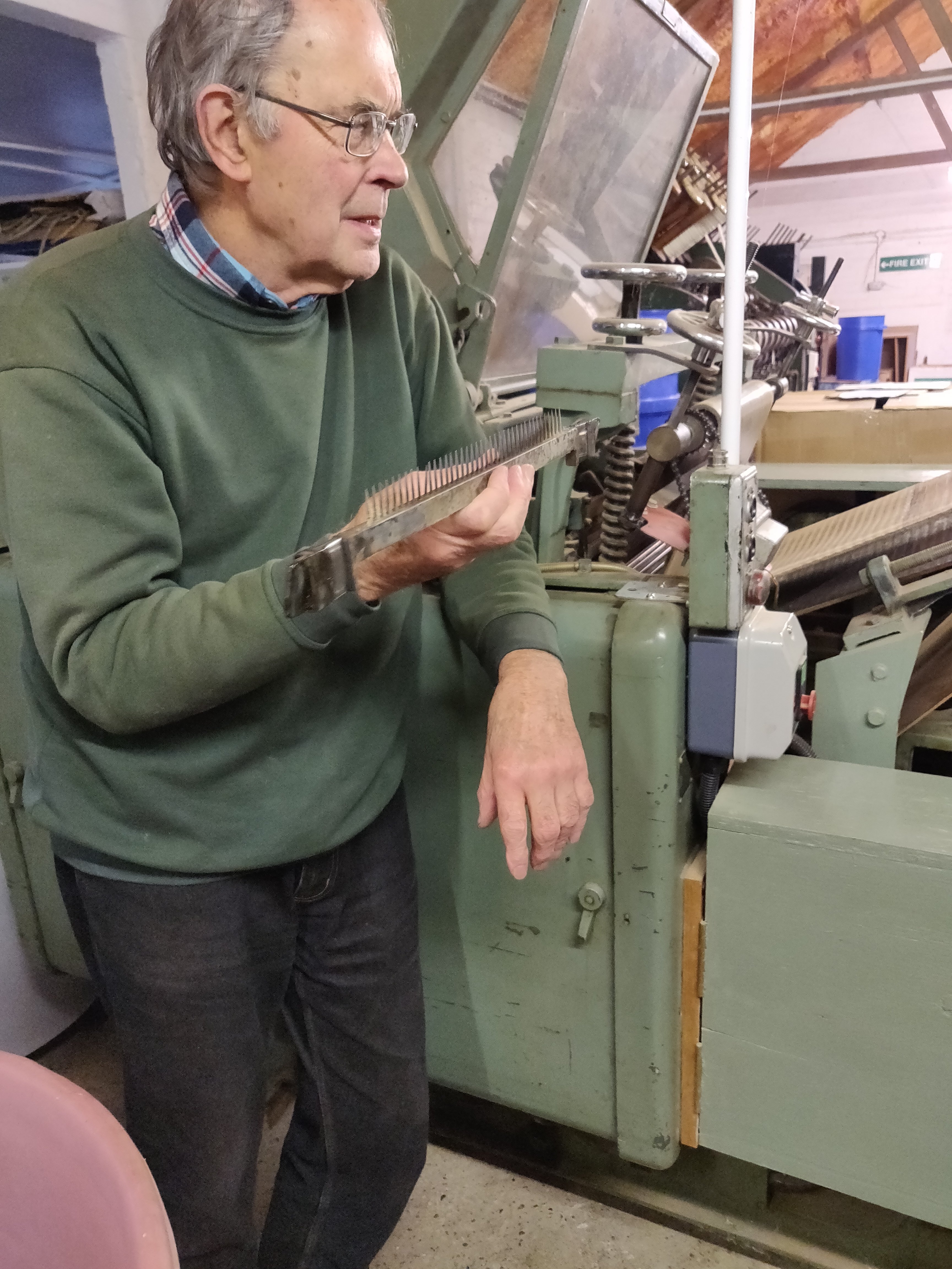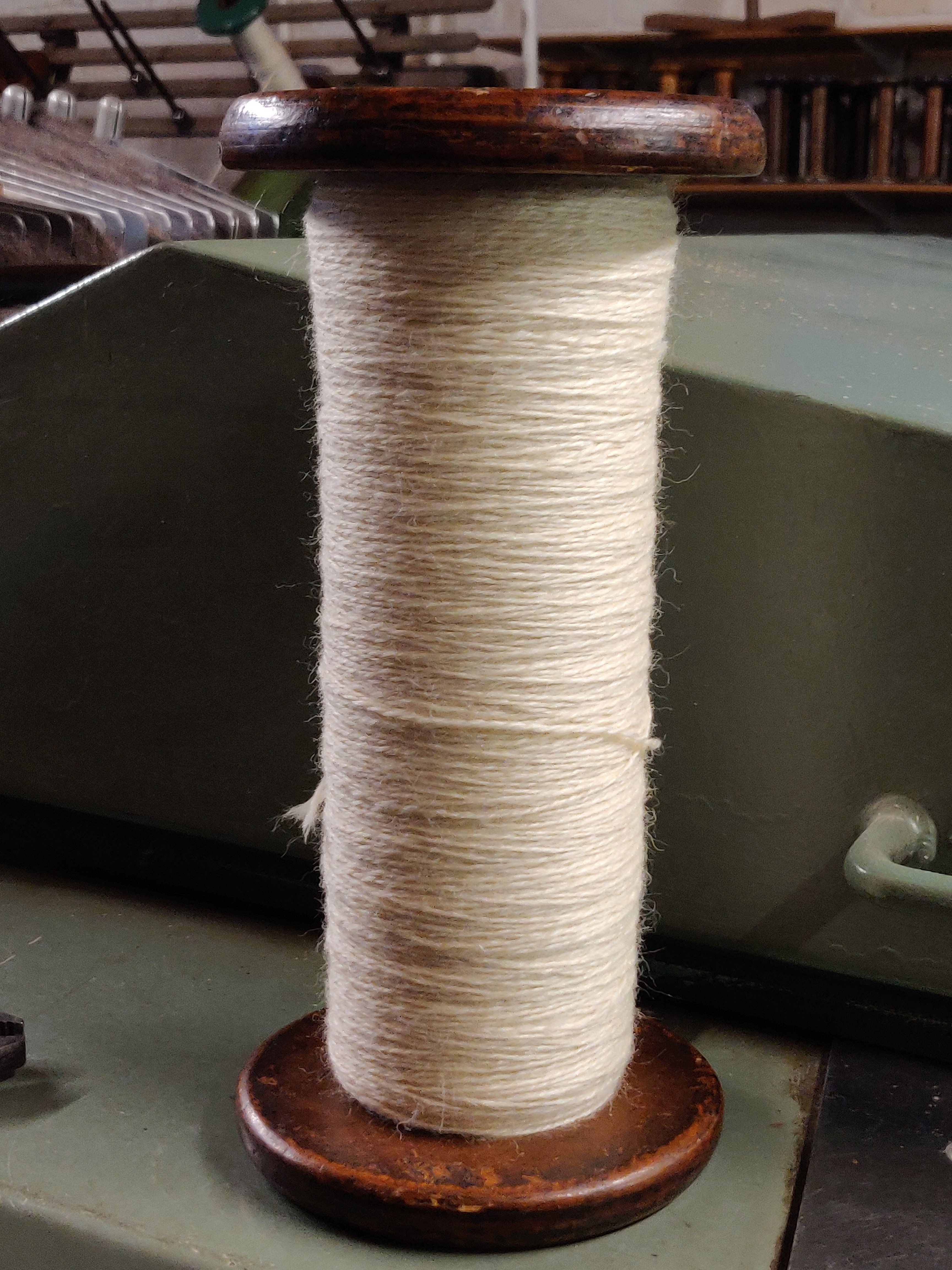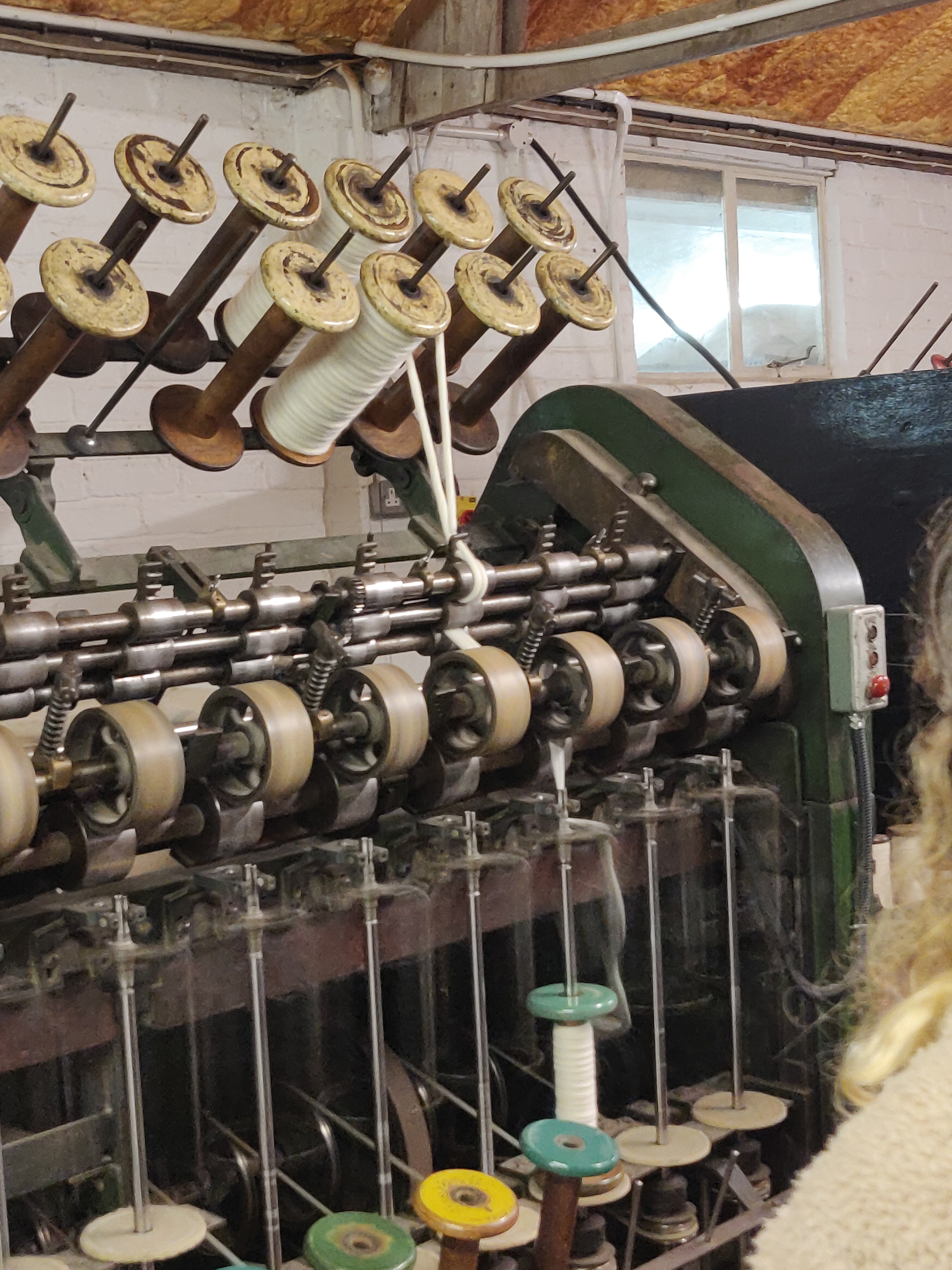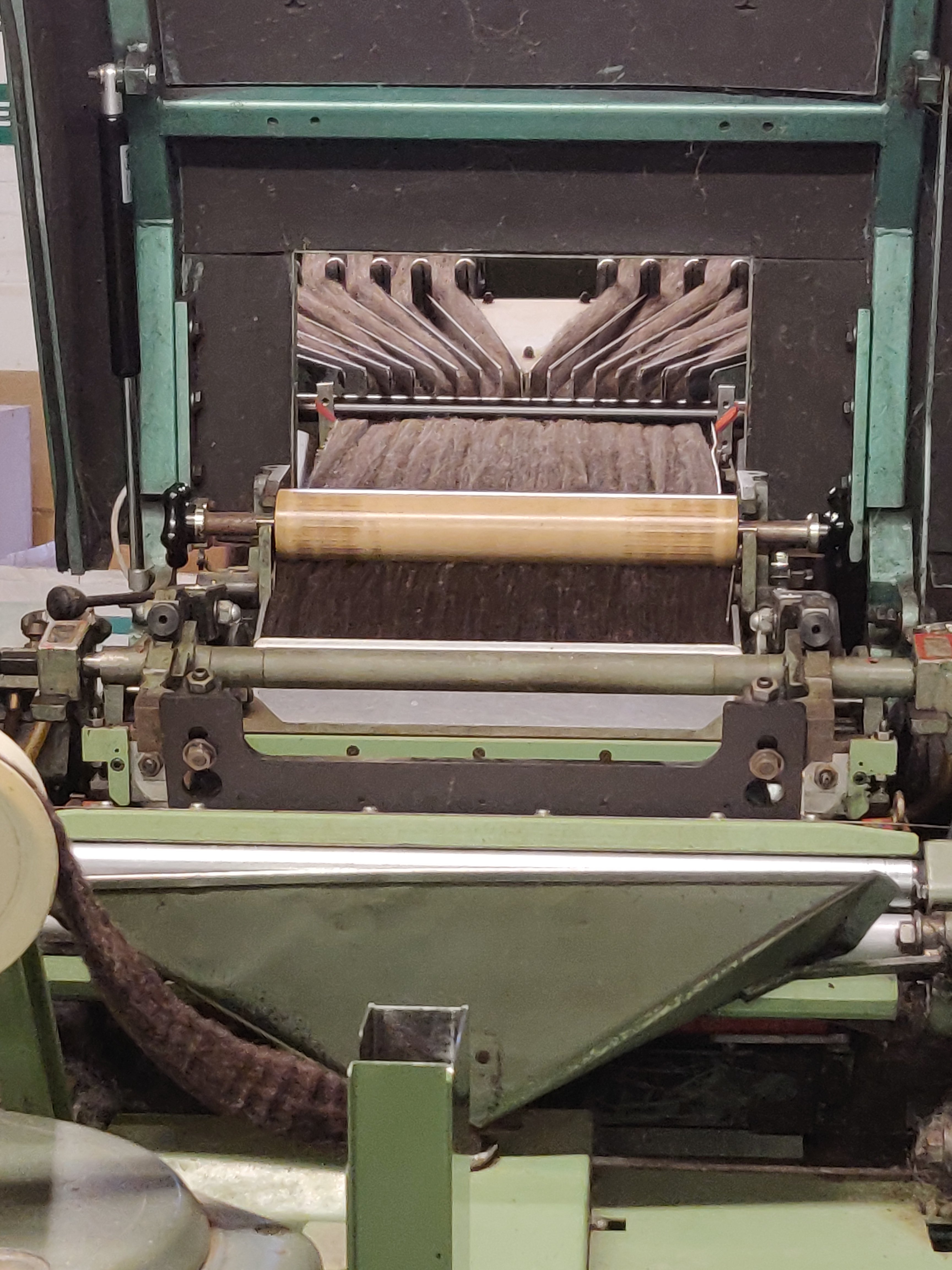 Following picking, the next process is carding the fibres to start aligning them in parallel into a continuous ”sliver’ of fibre. Unlike my meek little hand carder, they have a carding machine with 16 drums of metal, not wire, teeth. At this stage, any short fibres will still be in the sliver, it isn’t until combing that these will be removed.