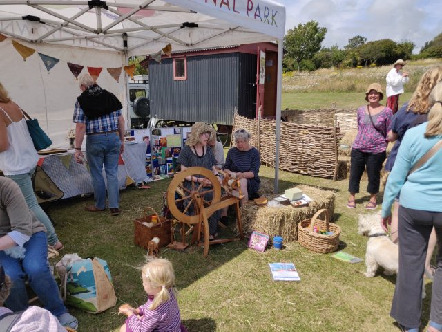 Whilst demonstrating as a member of a local textile group, Woolly Umbrella, at the Wild Chalk festival, I kept a drop-spindle of my own going with singles that I Andean plied at the end as part of the demo.