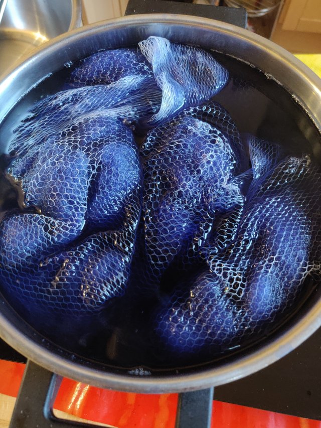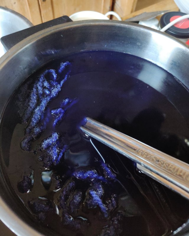For fun I added the knitted sample to a purple dye bath I had prepared to dye some other yarn, and here is the result.