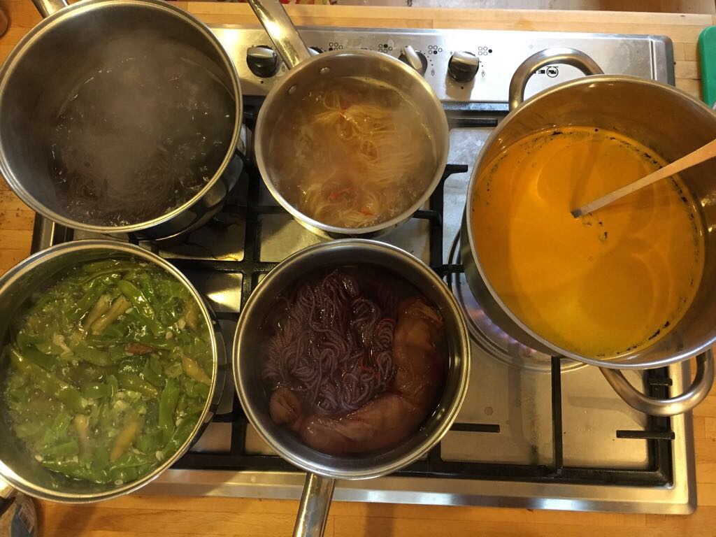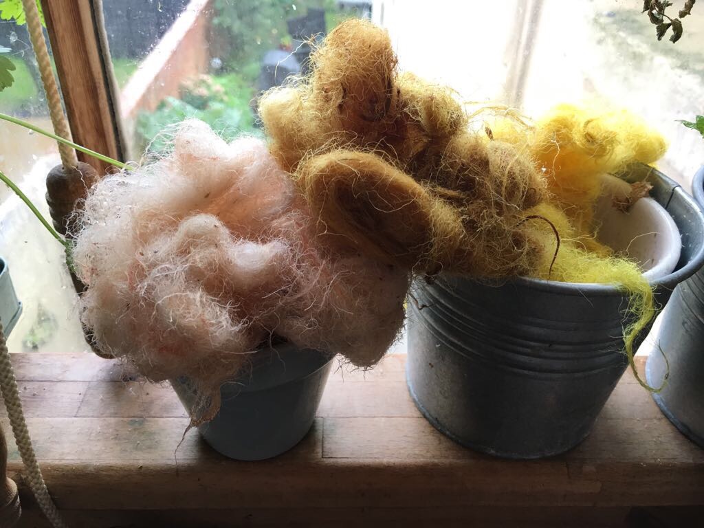 We used red cabbage, turmeric, avocado, onion skins and a lot of water and gas!Some people dyed wool yarns, I had some hand spun yarns and there was some fleece to test out in the dyebath. The avocados had been soaking for about 10 days in a mix of water and ammonia. I soaked the onions skins overnight in hot water. The red cabbage was chopped small and boiled for about an hour. All were brought to the simmer, but the avocados were not boiled. Yarn and fleece was mordanted overnight in 7% alum 8% cream of tartar, then rinsed before being put into the dyes. The red cabbage didn’t result in much by itself, a bluesy grey, but we split the bath into two pots. Adding ammonia to one brought out a wonderful warm green that stayed well after rinsing – we added a little salt to the dyebath to help this. To the other half we added vinegar, which resulted in a lovely. Lilac -pink tinged grey..By overdying the green from the red cabbage in the turmeric dyebath, we achieved a bright lettuce green.