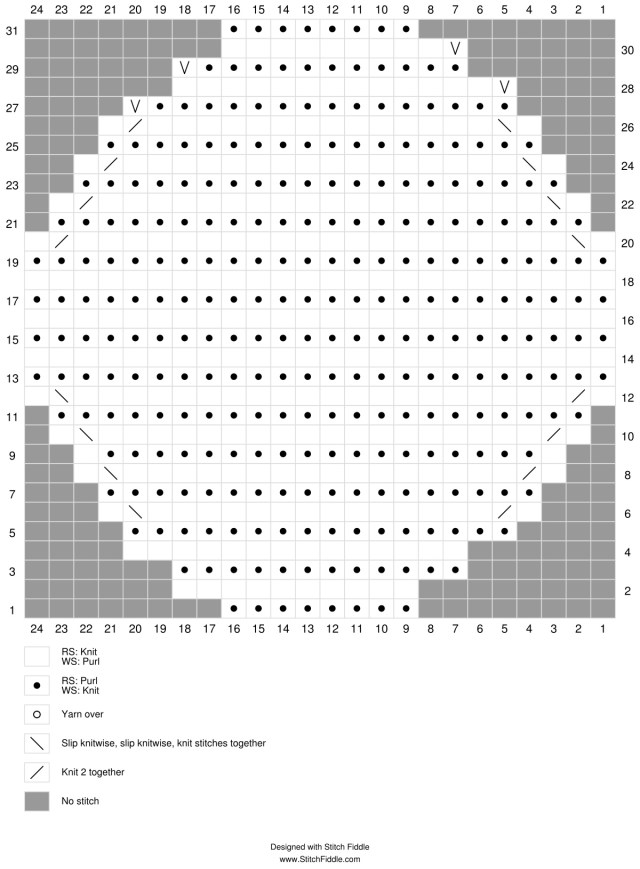 Row 26: k1, skpsso, k to 3 from end, k2tog, k1 (16)