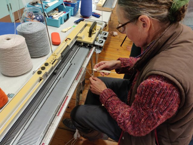 This workshop was organised to introduced members of Brighton Textile Art Group to machine knitting. I took a Knitmaster 700 standard gauge punch card machine and a Brother 260 chunky. The chunky was particularly popular once it was found that it could knit handspun yarns.